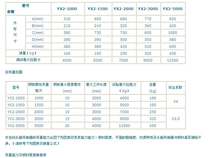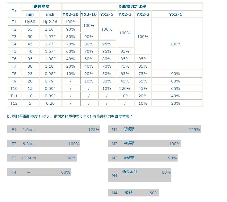 以上圖表為參考值,安全系數(shù)×3.5倍,本永磁吊裝器的吊重能力標(biāo)示為測試吸力的1/4。如LS2-1的吊重能力為1000kg,但其實際測試吸力為大于4000kg。(大的安全系數(shù),為考慮及確保使用的安全因素)如欲吊的鋼材超出上述吊重范圍,請于吊離鋼材前先測試,無安全之慮后再行使用,如因故發(fā)生危險,則本公司恕不負(fù)責(zé)。本產(chǎn)品由www.scp-kr.net提供